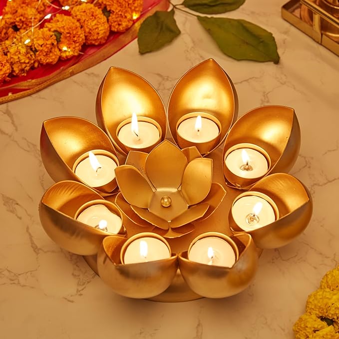 This piece brings the charm of blooms into your festive setup without the need for upkeep with a beautiful design of diya.